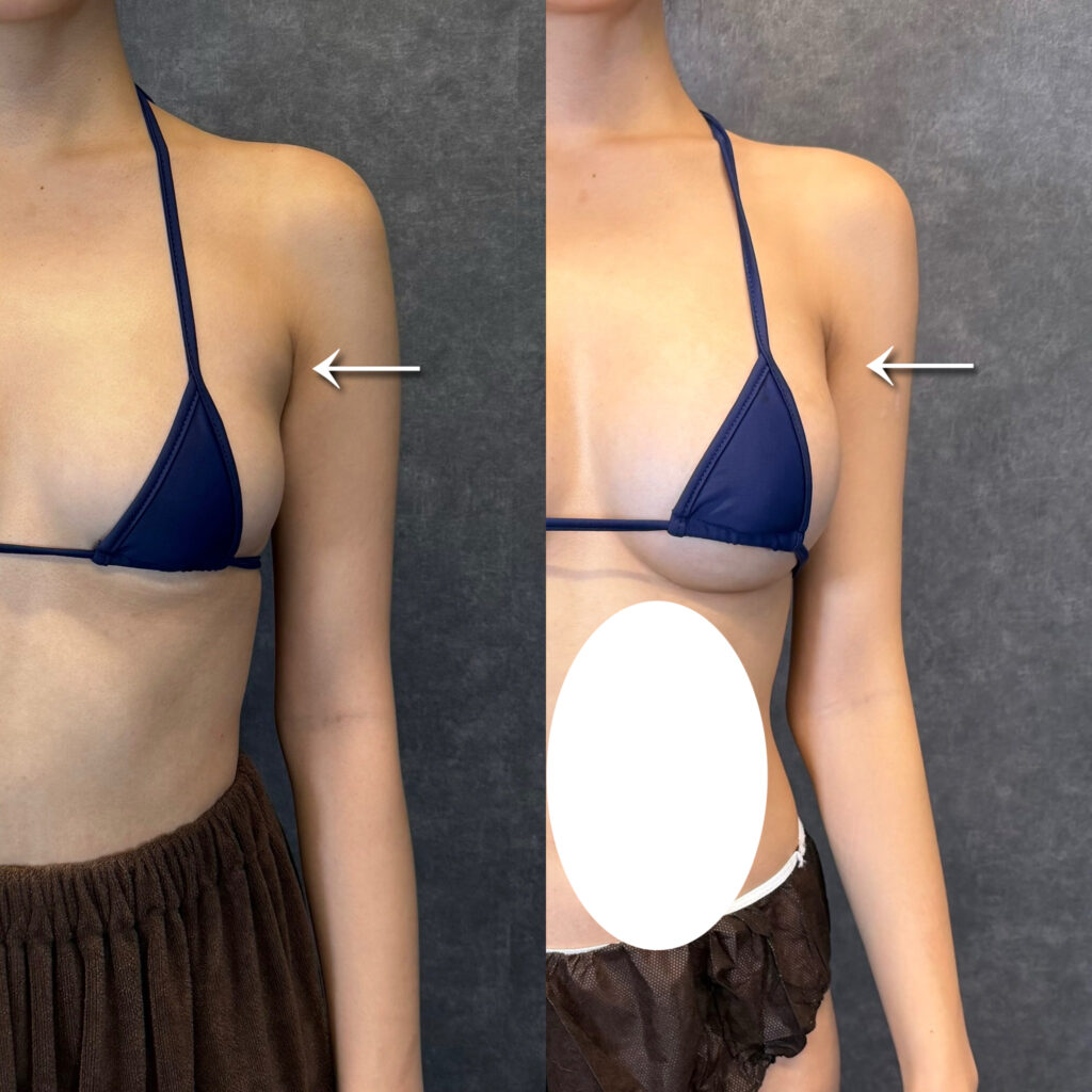 「二の腕だけ脂肪吸引したい」という方も多いですが、二の腕が細くなると、相対的に脇前の副乳の膨らみが目立ってしまうことがよくあります。