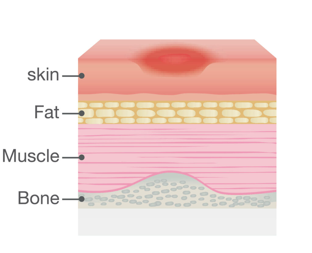 皮膚 → 皮下脂肪 → 筋肉 → 骨