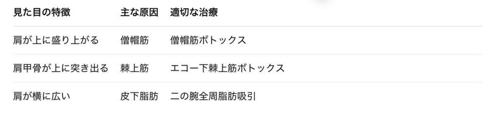 実は、肩ボトックスが“金ドブ”になってしまう最大の原因は、肩の張り出しの本当の原因が“僧帽筋”ではないケースにあります。