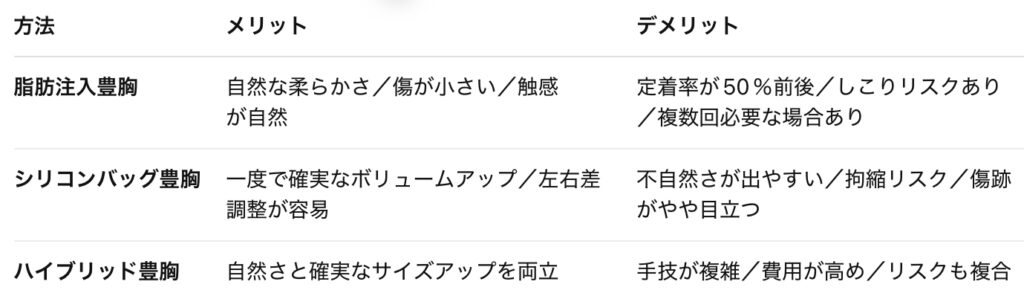 脂肪注入豊胸は、「自然で美しい仕上がり」を求める方には最適な施術ですが、過剰注入によるしこりリスクを避けることが最優先です。