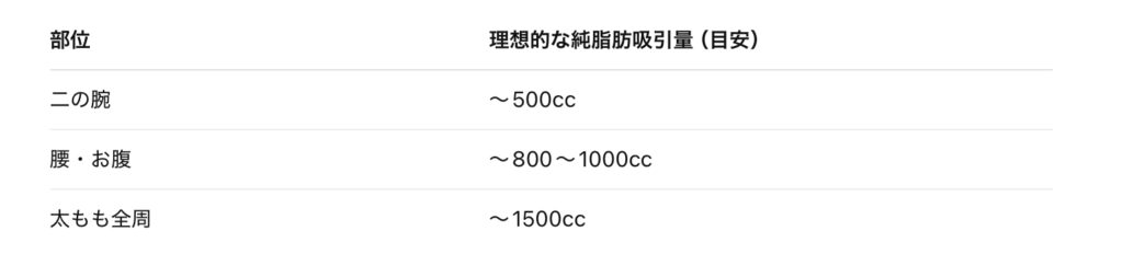脂肪量が多ければ良いというわけではなく、以下のように部位別に“理想吸引量”があります。