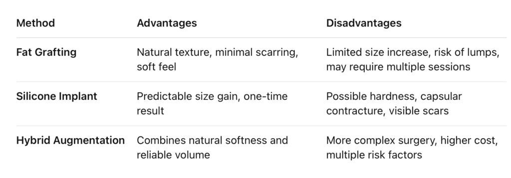 For those who wish to gain more than two cup sizes, staged fat grafting (two or more sessions) or hybrid augmentation is often the safest and most effective option.