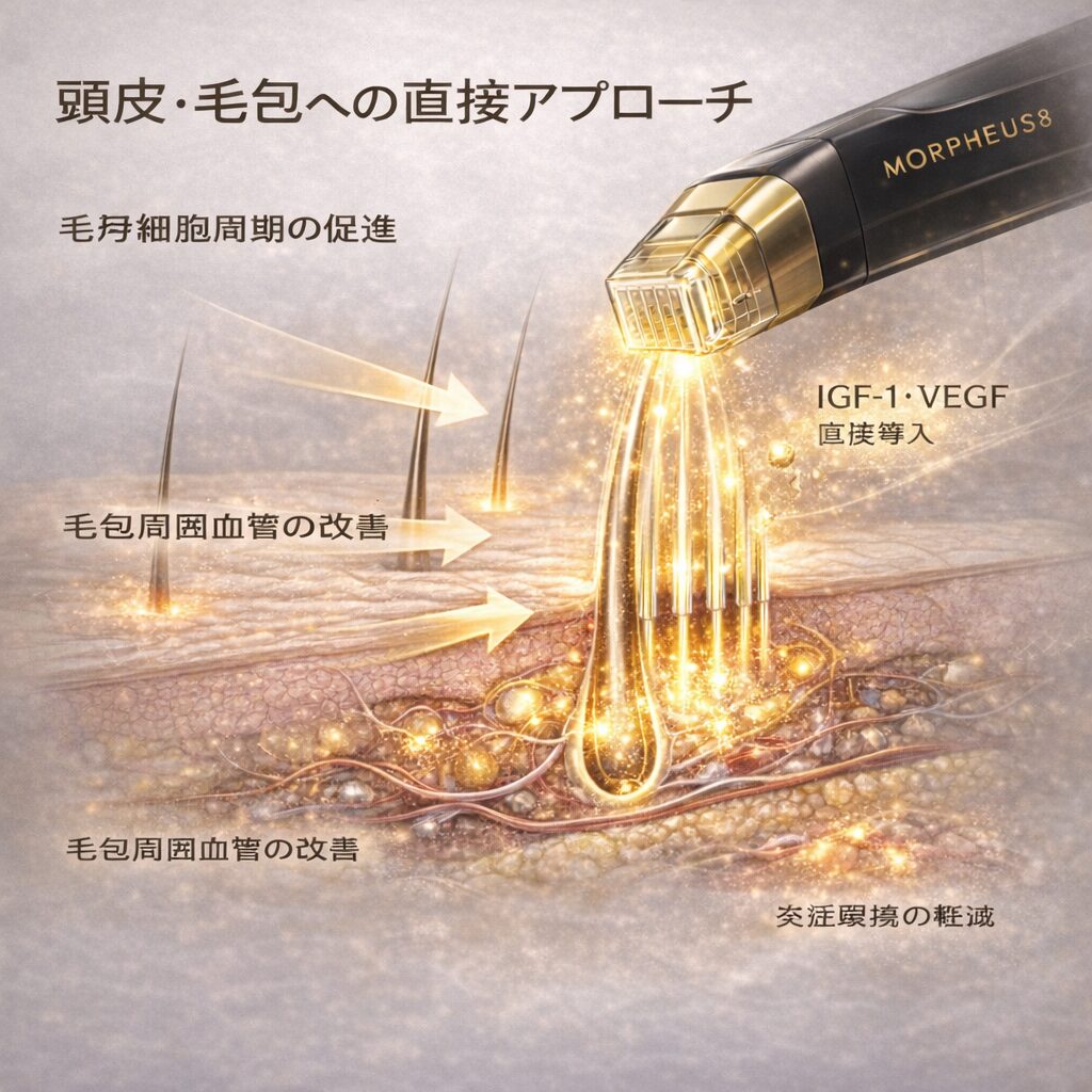 モフィウス8で頭皮に微細孔を形成し、IGF-1やVEGFを直接導入することで、