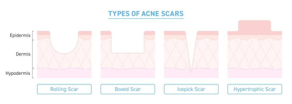 Atrophic acne scars (ice-pick, boxcar, rolling types) are true scars,