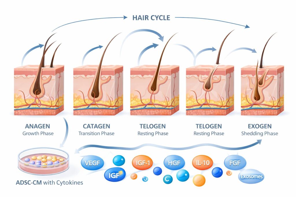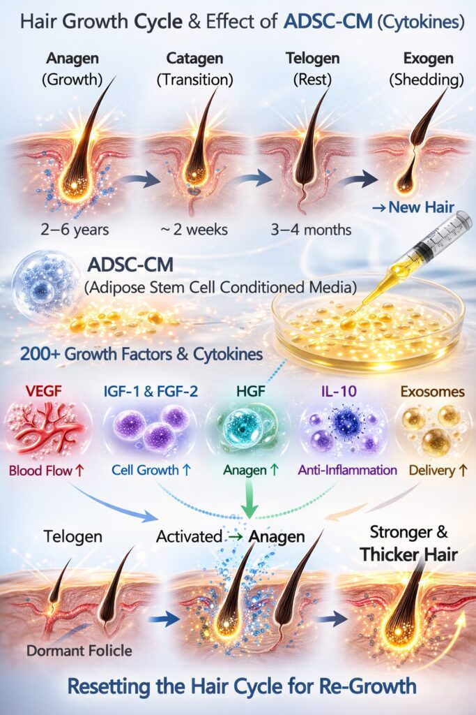 ADSC-CM (Adipose-Derived Stem Cell Conditioned Media), which contains hundreds of growth factors and cytokines, can shift the follicle environment toward regeneration.