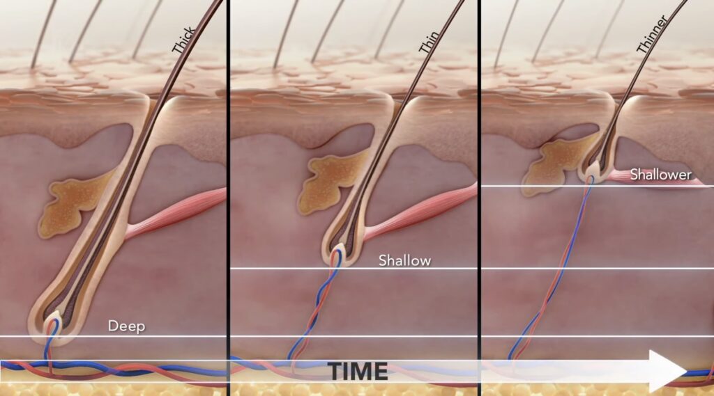 In other words, the follicles do not suddenly disappear. Instead, over time they produce hair that becomes thinner, shorter, and weaker, until the follicles are no longer able to produce strong terminal hair.